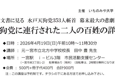 団体イベント情報 (登録団体からのお知らせ)天狗党に連行された二人の百姓の詳述【いちのみや大学】 Posted on 2026-03-04 一宮市市民活動支援センター登録団体のイベント情報です。 ———————————— Read more…