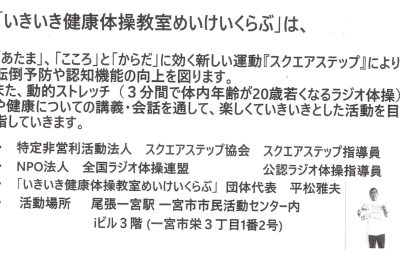 団体イベント情報 (登録団体からのお知らせ)「いきいき健康体操教室めいけいくらぶ」は、 【いきいき健康体操教室めいけいくらぶ】 Posted on 2026-03-04 一宮市市民活動支援センター登録団体のイベント情報です。 ———————————— Read more…