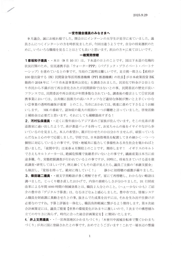 「一宮市議会議員のみなさまへ」全議員(38名)にお渡ししています。