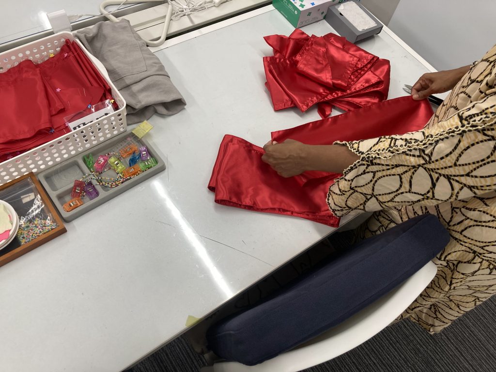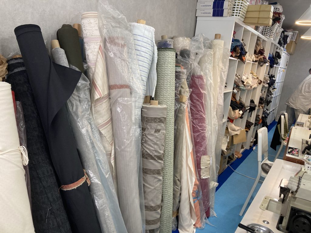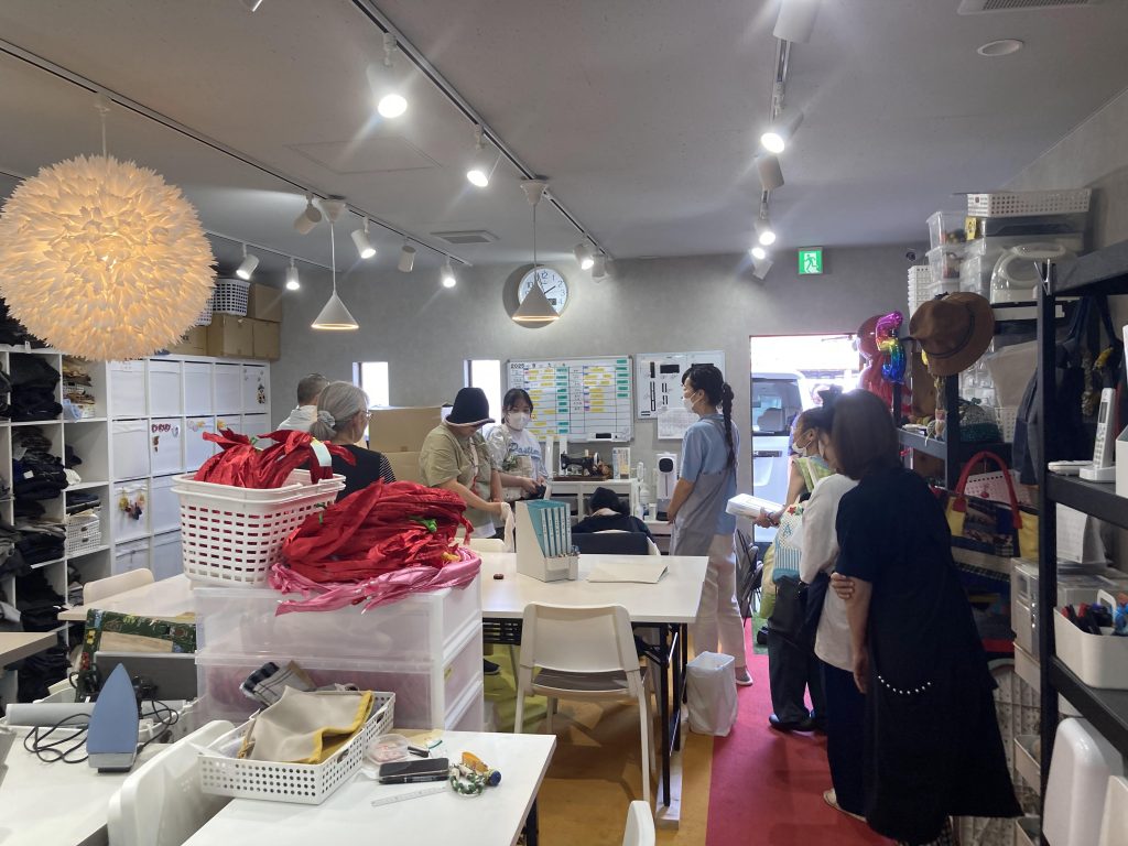 白を基調とした室内には、色とりどりの反物やミシンなど様々な道具が並び、利用者のみなさんがミシン掛け作業や袋詰め前の生地を折るなど黙々と作業をされていました。
