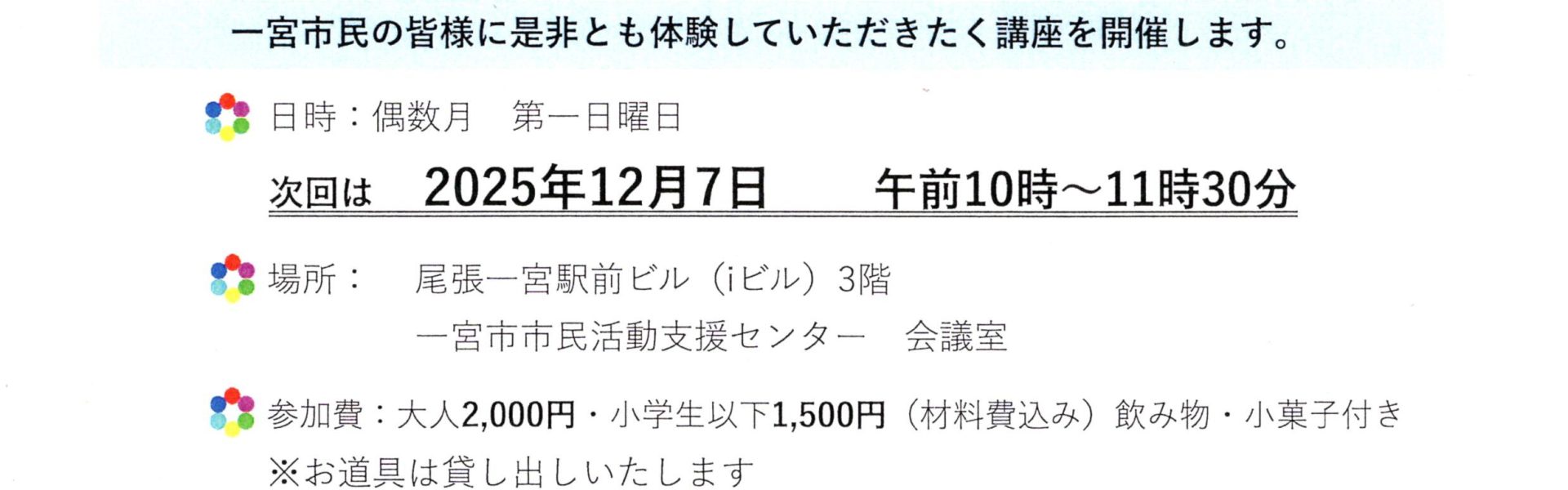 参加費:大人2,000円・小学生以下1,500円(材料費込み)飲み物・小菓子付き