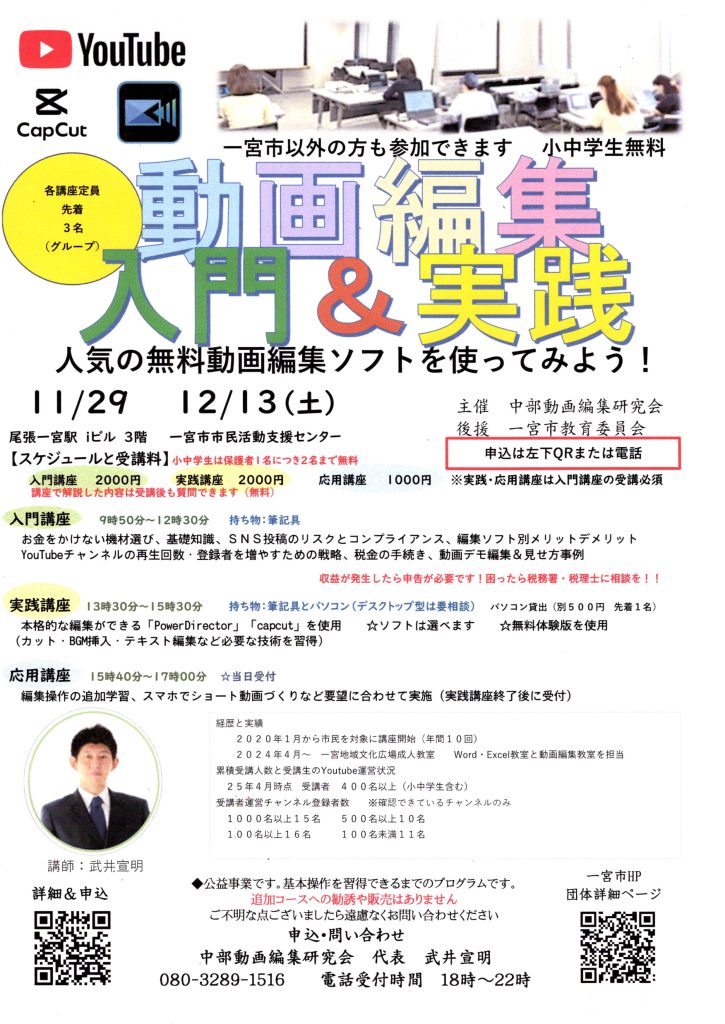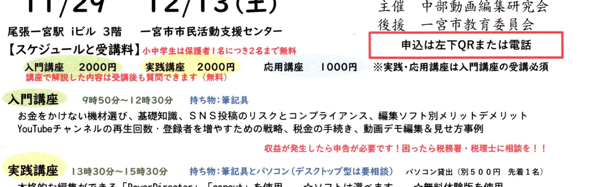 申込・問い合わせ:中部動画編集研究会 代表 武井宣明 080-3289-1516 電話受付時間18時~22時