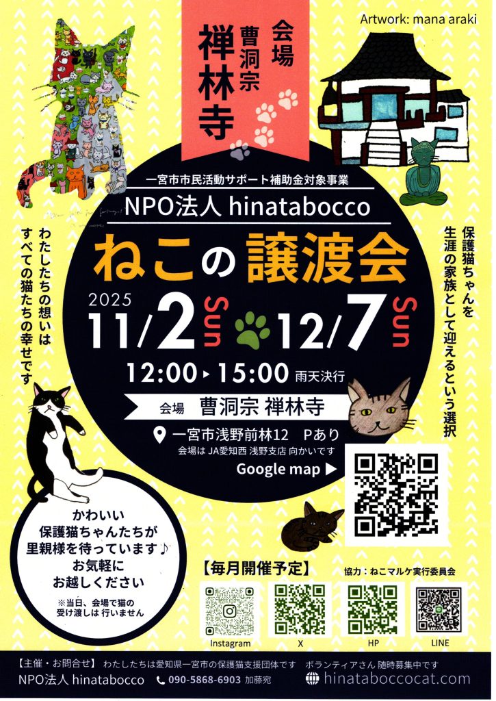 (登録団体からのお知らせ)猫の譲渡会【NPO法人hinatabocco】