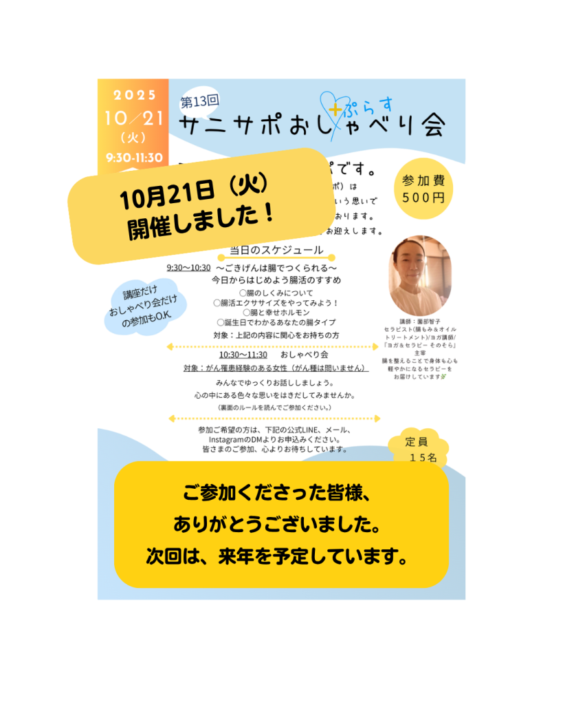 10月21日(火)に「第13回サニサポおしゃべり会+ぷらす」を開催しました。今回のテーマは「ごきげんは腸でつくられる〜今日からはじめよう腸活のすすめ〜」。講師にはセラピストの薗部智子さんをお迎えし、腸と心・体の深い関係についてお話しいただきました。
