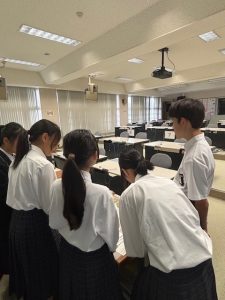 校長室とクラスのモニターを繋ぎ、ゲームの主旨が説明されます。説明後モニターの電源が切れてからいよいよスタート。担任の先生からナゾトキの用紙が配られました。それに従ってチームに分かれナゾを解いていきます。ひとつのナゾが解けたら教室の外へ! 答えに導かれた生徒たちは校舎内のあちこちにちりばめられたナゾトキを楽しみ、解けた答えをクラスに持ち帰ります。