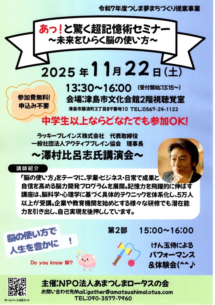 (登録団体からのお知らせ)あっ!と驚く超記憶術セミナー~未来をひらく脳の使い方~【NPO法人あまつしまロータスの会】