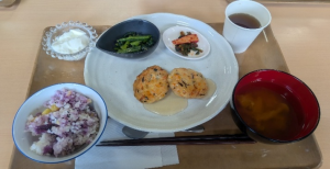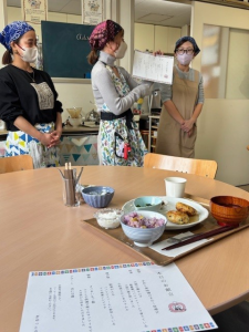 Ada-codaは、センター内の交流室で営業。この日は「Iぎゅっとパパママ学級知多~産前産後ケア」の方々がワンデイシェフの担当でした。ランチをいただく前に献立の説明があり、手づくり味噌や団体が育てた野菜などを使ったお料理をいただきました。