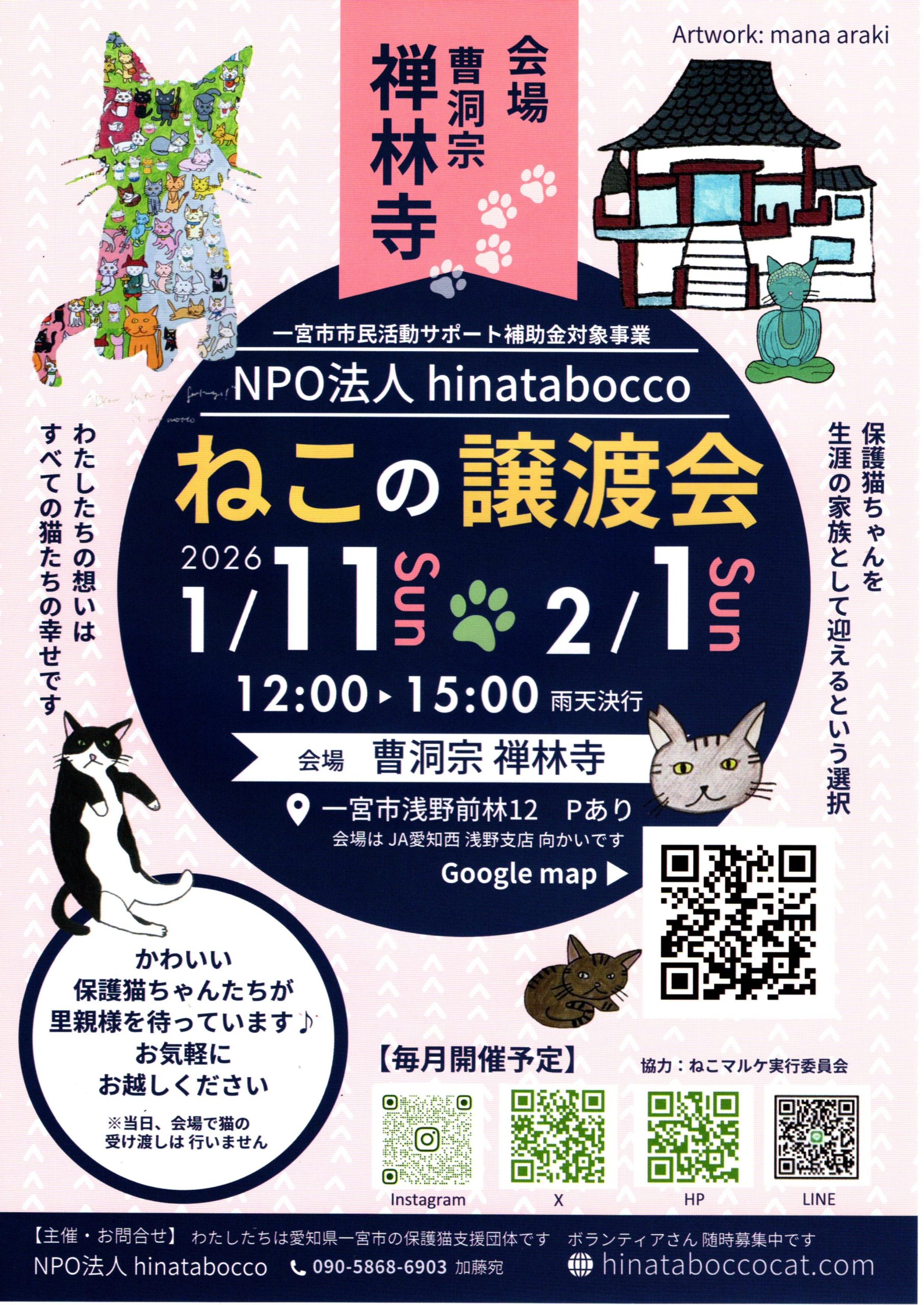(登録団体からのお知らせ)ねこの譲渡会【NPO法人hinatabocco】
