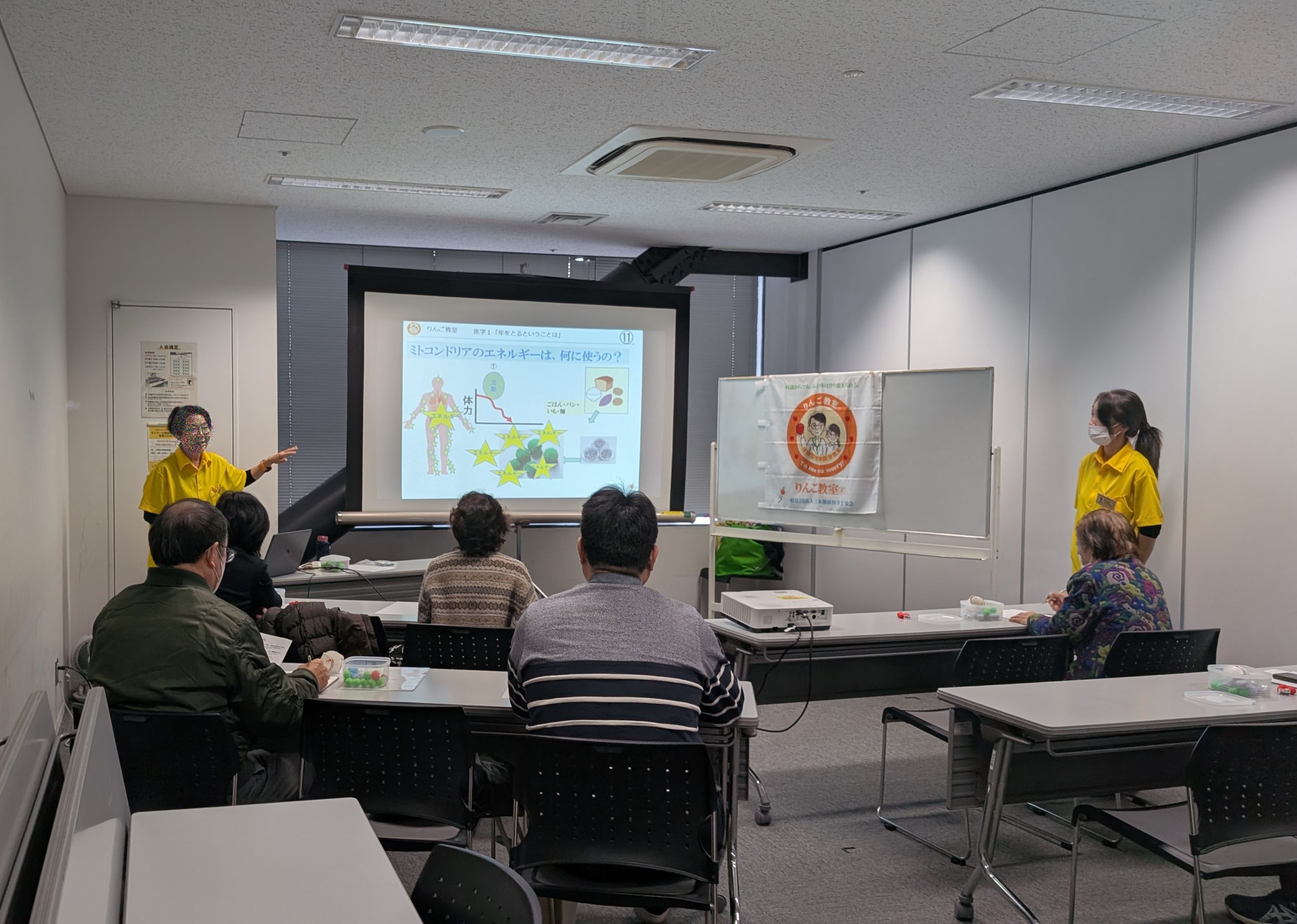 りんご教室は、「何歳からでも心と体はつくりかえられる」をテーマに、年をとる仕組みを理解し、普段から取り組める運動や体によい食事、足腰の痛み、ストレスや不安との付き合い方などについて学び、実践する体験型教室です。