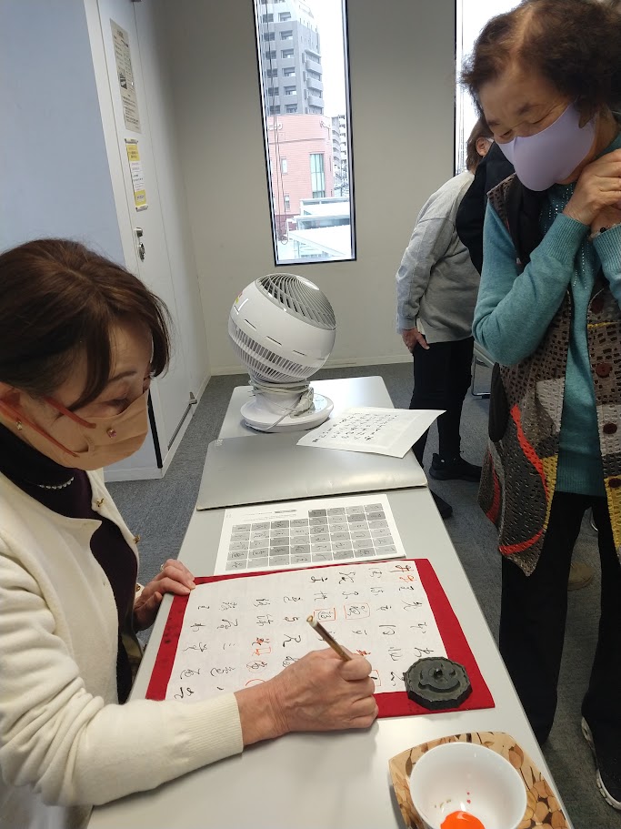 参加者はお手本を元に筆を動かし、出来上がったものを添削してもらっていました。