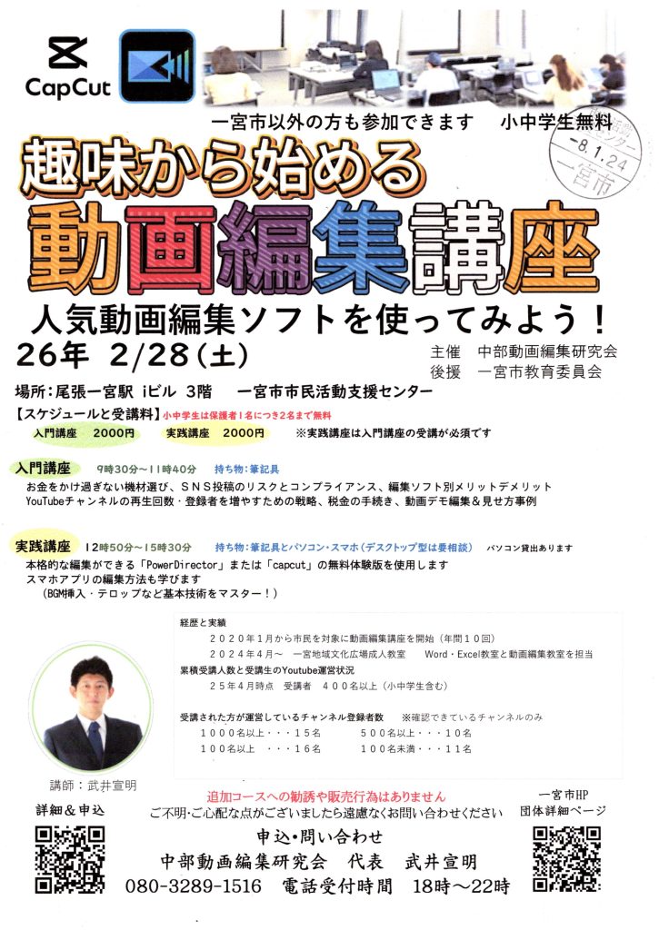申込・問い合わせ:中部動画編集研究会 代表 武井宣明 080-3289-1516 電話受付時間18時~22時