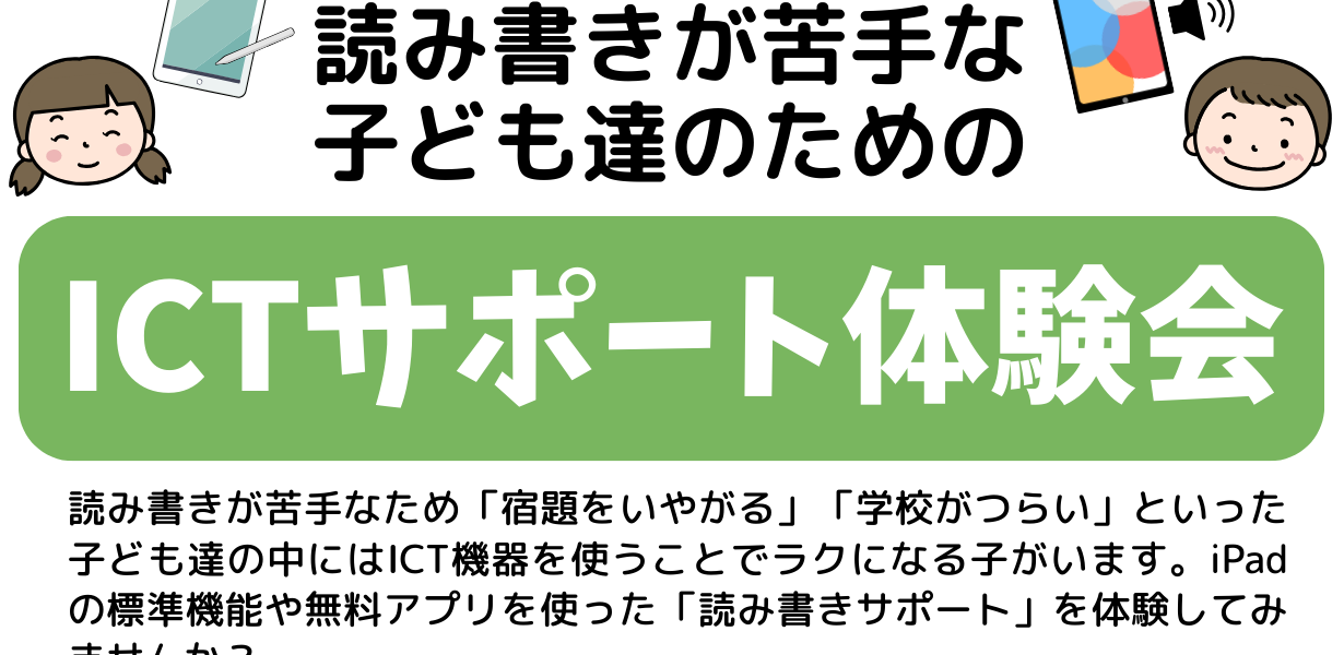 読み書きが苦手な子ども達のためのICTサポート体験会のお知らせです。