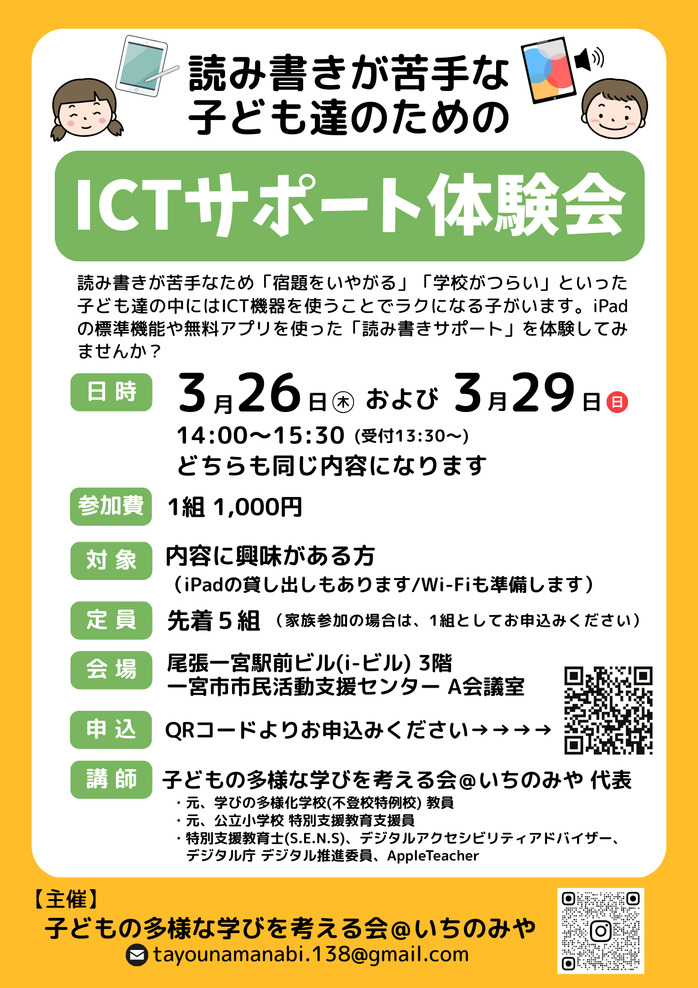 (登録団体からのお知らせ)2026/3/26および29「読み書きが苦手な子ども達のためのICTサポート体験会」のお知らせ【子どもの多様な学びを考える会@いちのみや】