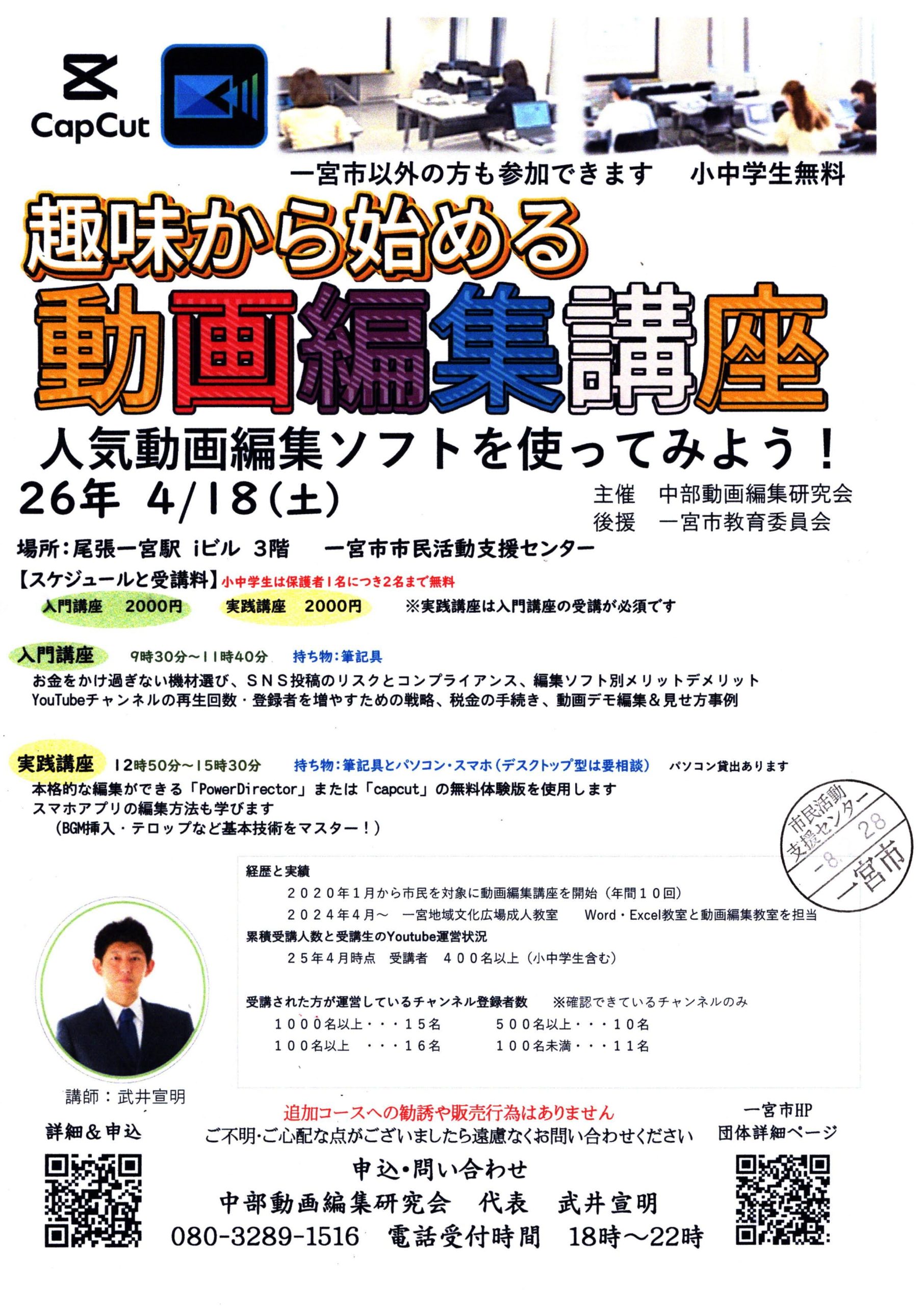 申込・問い合わせ:中部動画編集研究会 代表 武井宣明 080-3289-1516 電話受付時間18時~22時