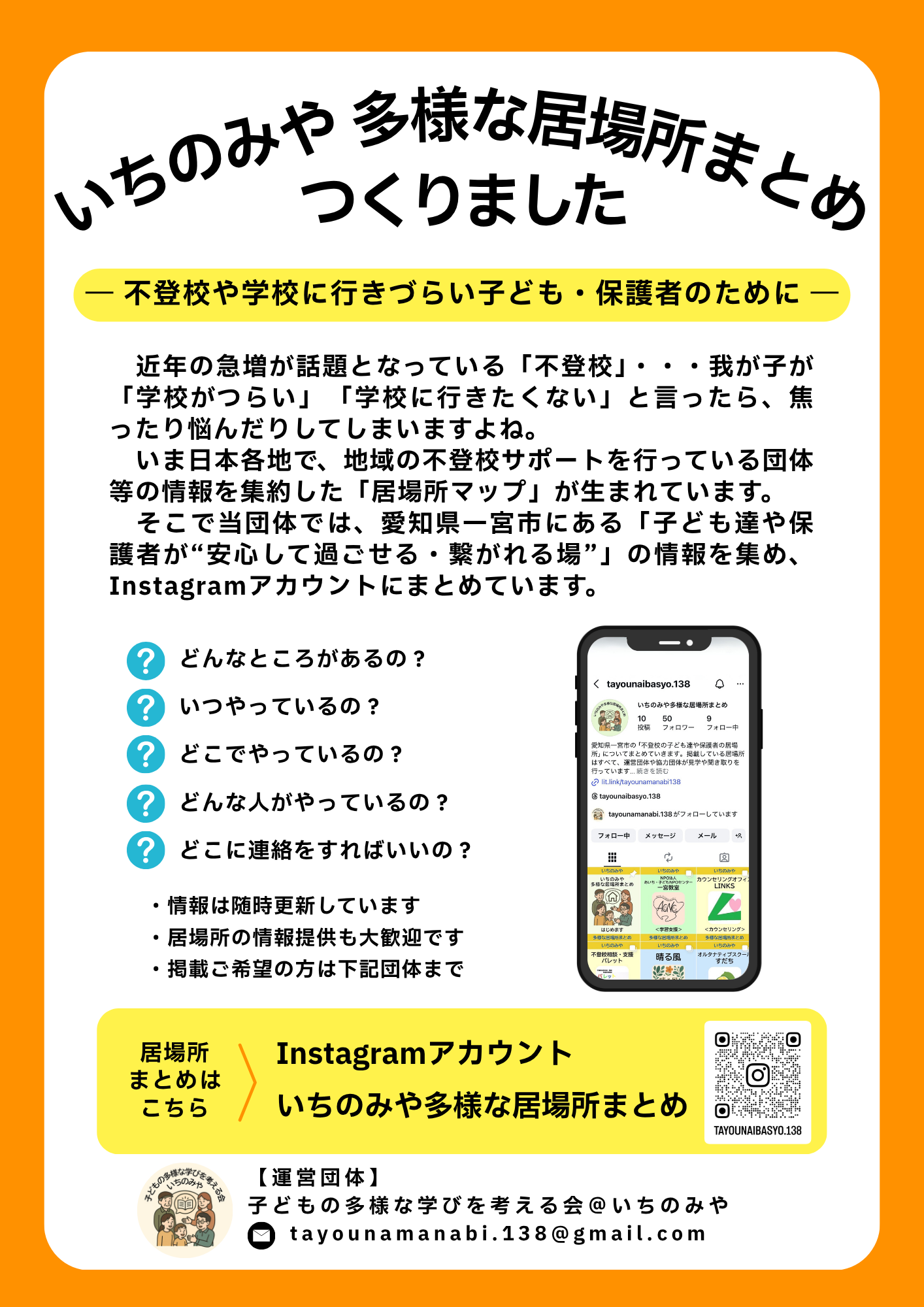 運営団体「子どもの多様な学びを考える会@いちのみや」Instagramアカウント
