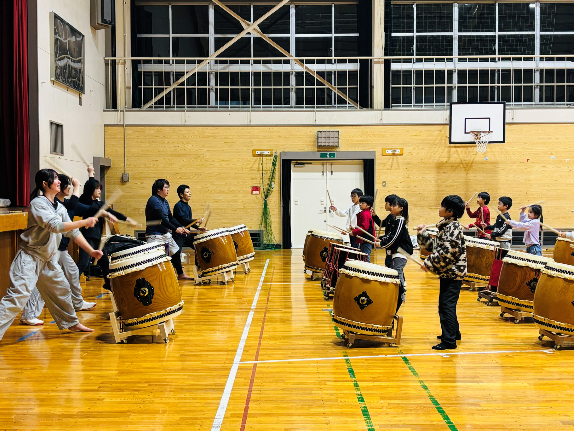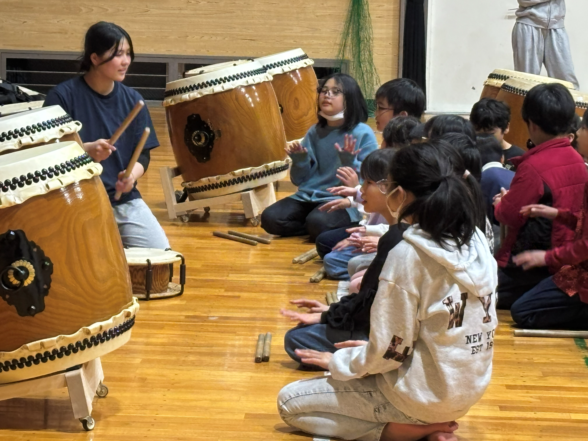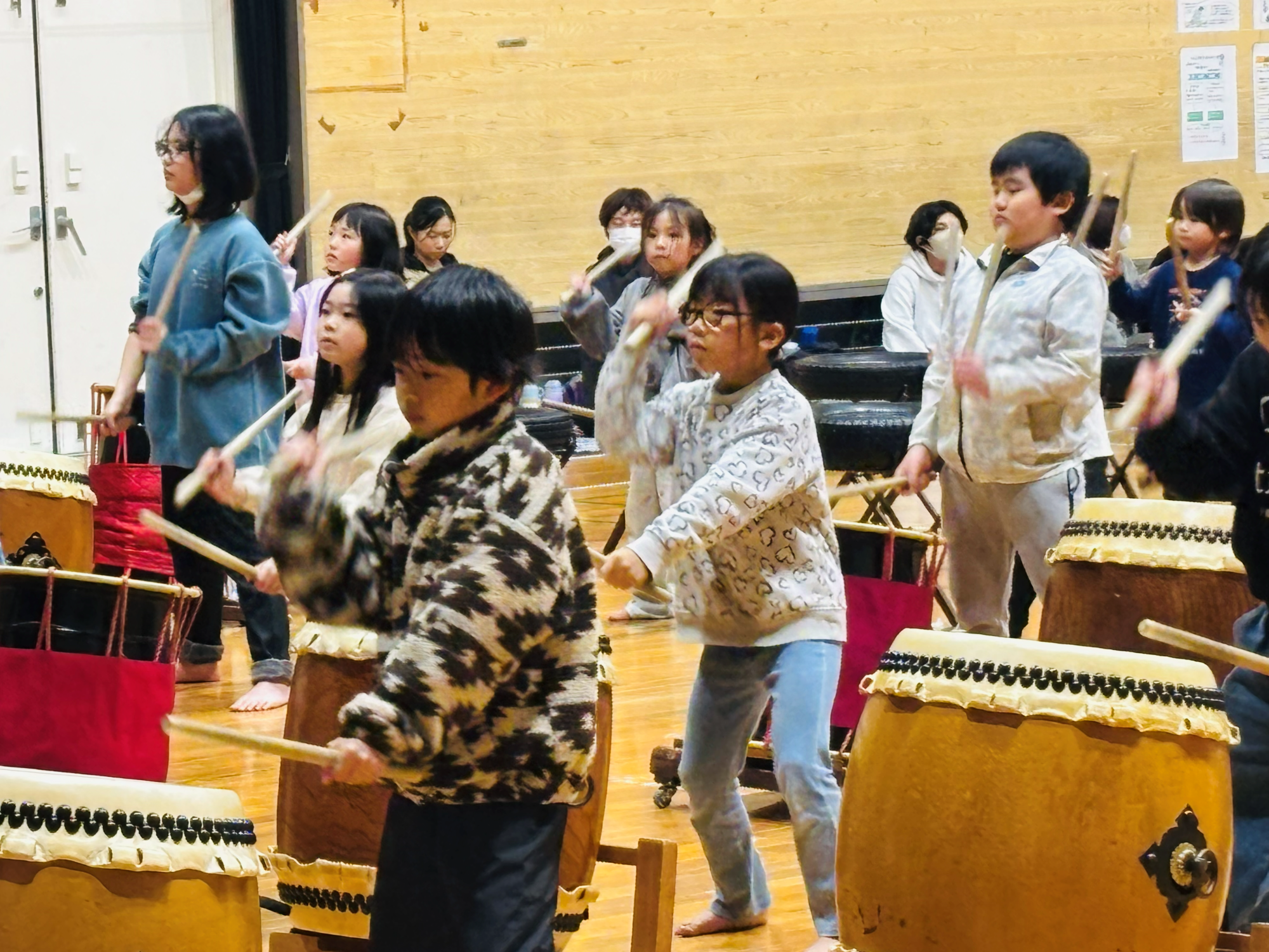 写真は、中学生以上のメンバーが小学生以下のメンバーに教えている様子です。教えるといっても一からではなく、それぞれおうちで練習をしてきます。子どもたちに、太鼓覚えるの大変じゃない?と聞くと、「楽しいよ!」「おうちで動画見て練習するよ!」と元気に答えてくれました。