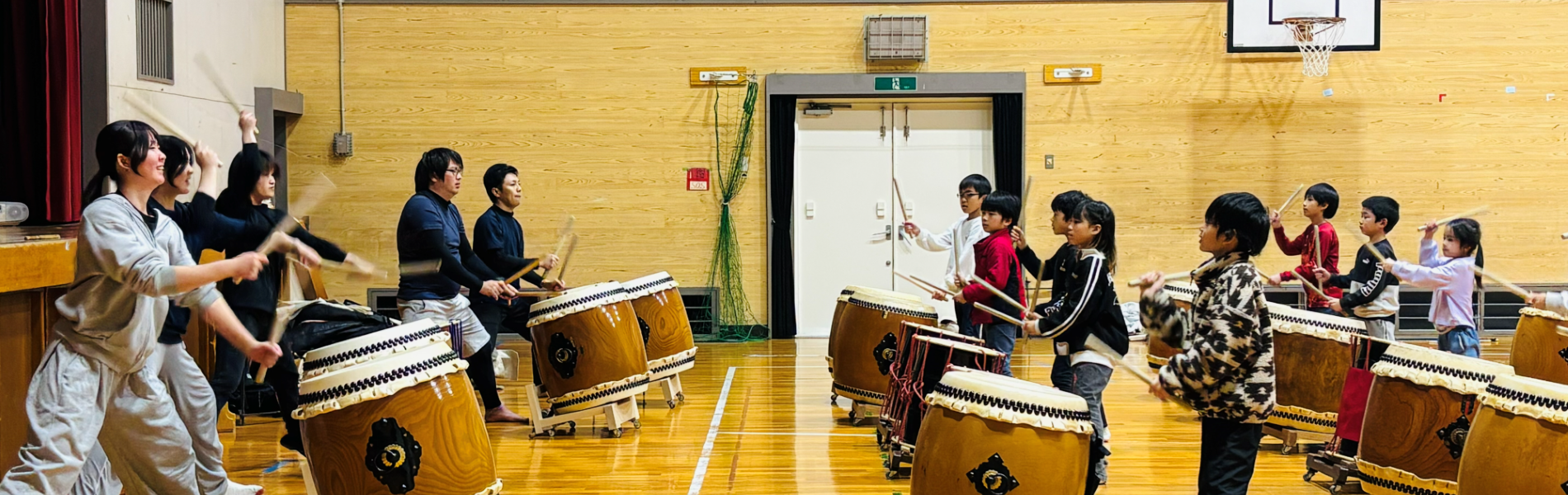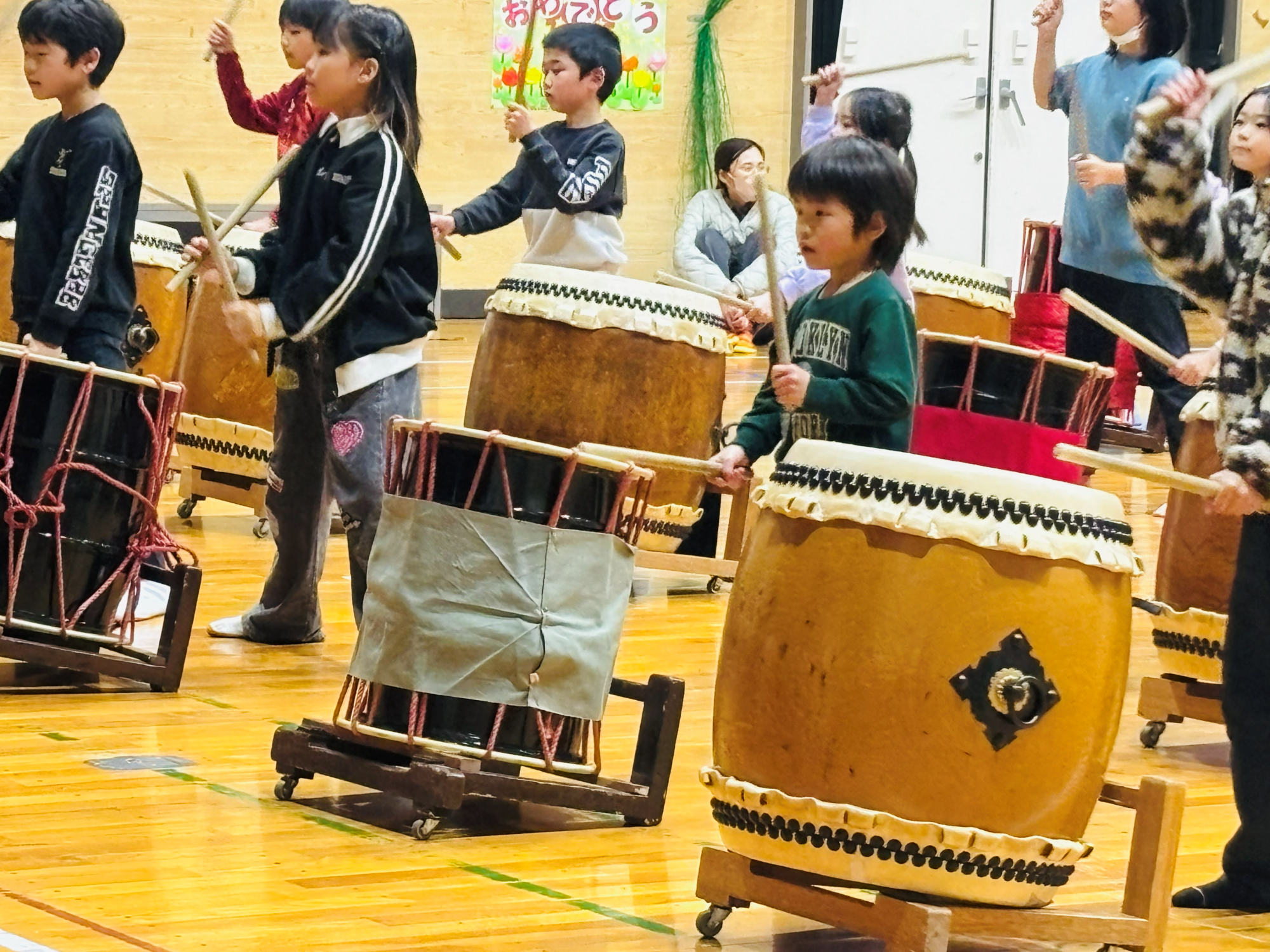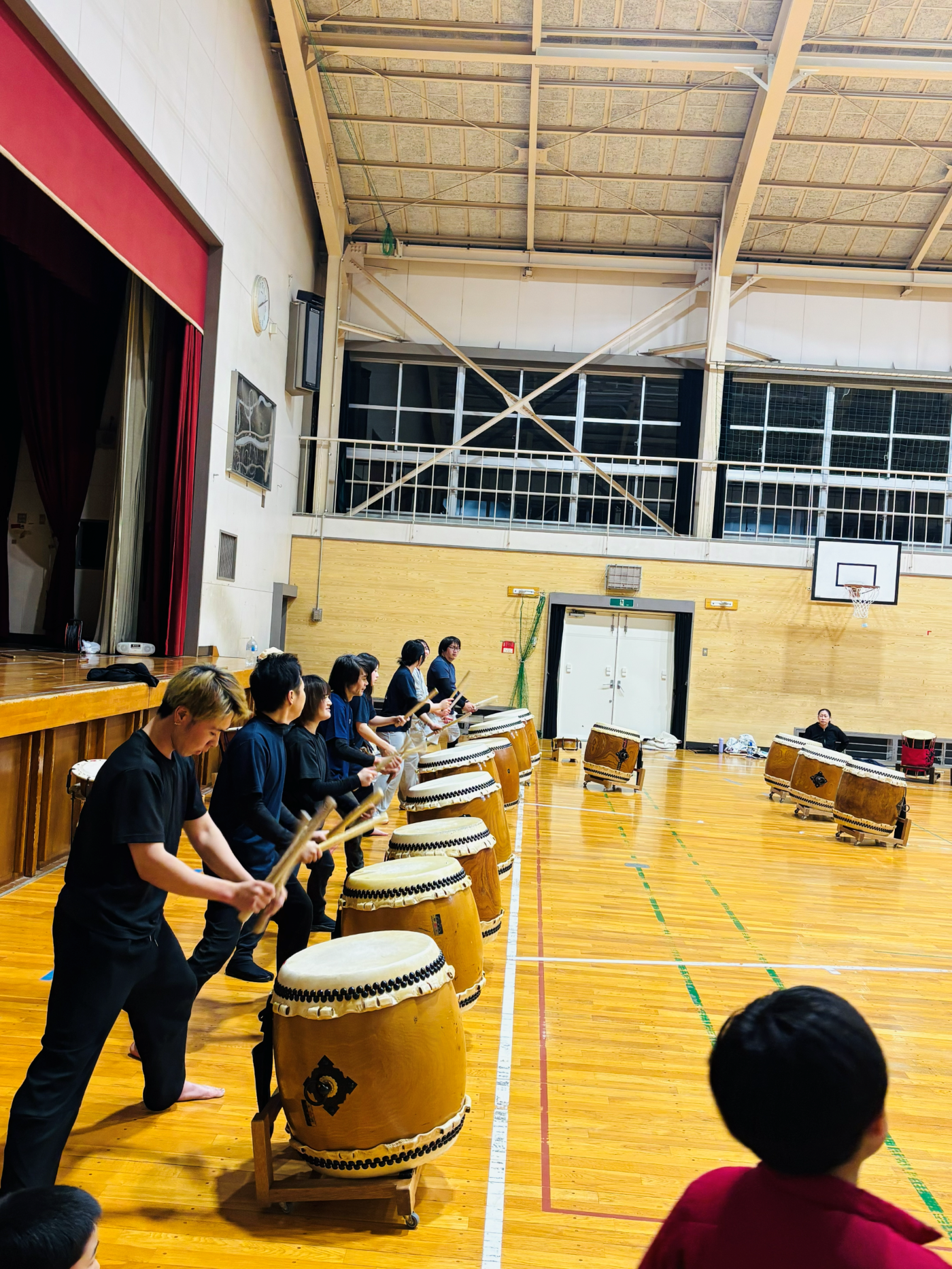 写真は、中学生以上のメンバーが小学生以下のメンバーに教えている様子です。教えるといっても一からではなく、それぞれおうちで練習をしてきます。子どもたちに、太鼓覚えるの大変じゃない?と聞くと、「楽しいよ!」「おうちで動画見て練習するよ!」と元気に答えてくれました。