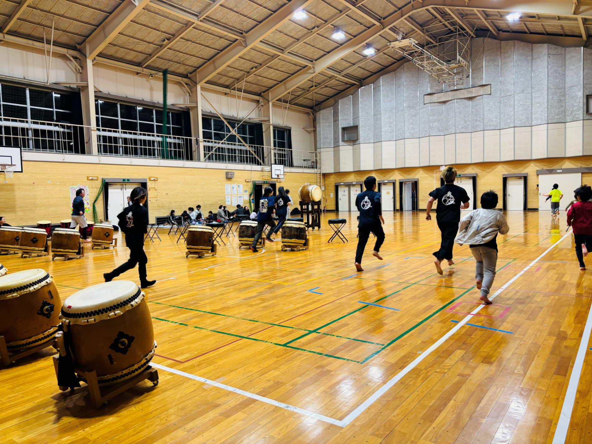 替わって次は中学生以上の練習です。まずは体力づくりの一環で、タイマーが鳴るまで太鼓を叩き続け、鳴ったら走り込む。それを1セットとして数回繰り返していました。見ているだけでハード!さらに、さっきまで太鼓練習をしていた子どもたちも一緒になって走り、子どもの元気さと体力の無限さにこちらまで元気をもらいました。