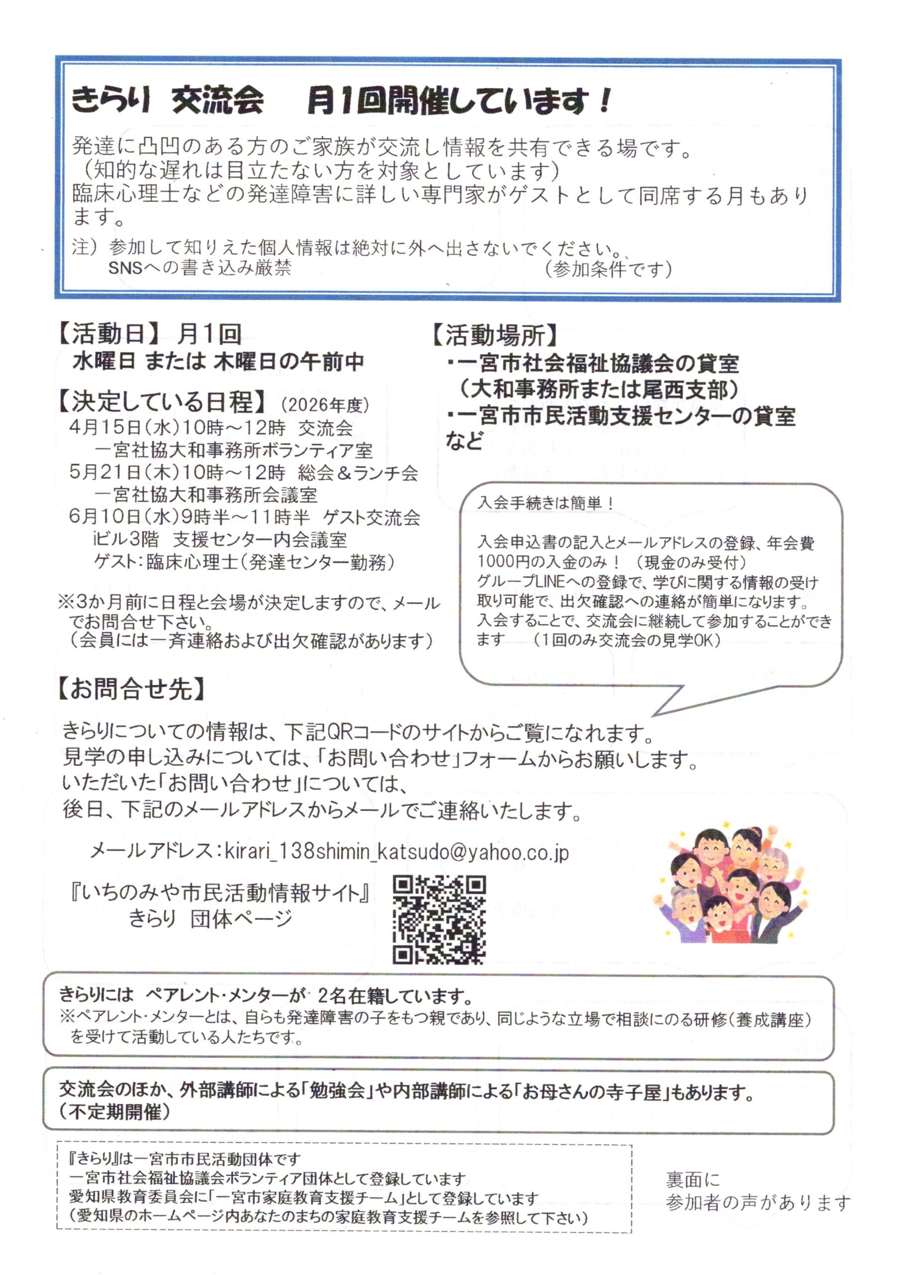 (登録団体からのお知らせ)きらり交流会 月1回開催しています!【きらり】