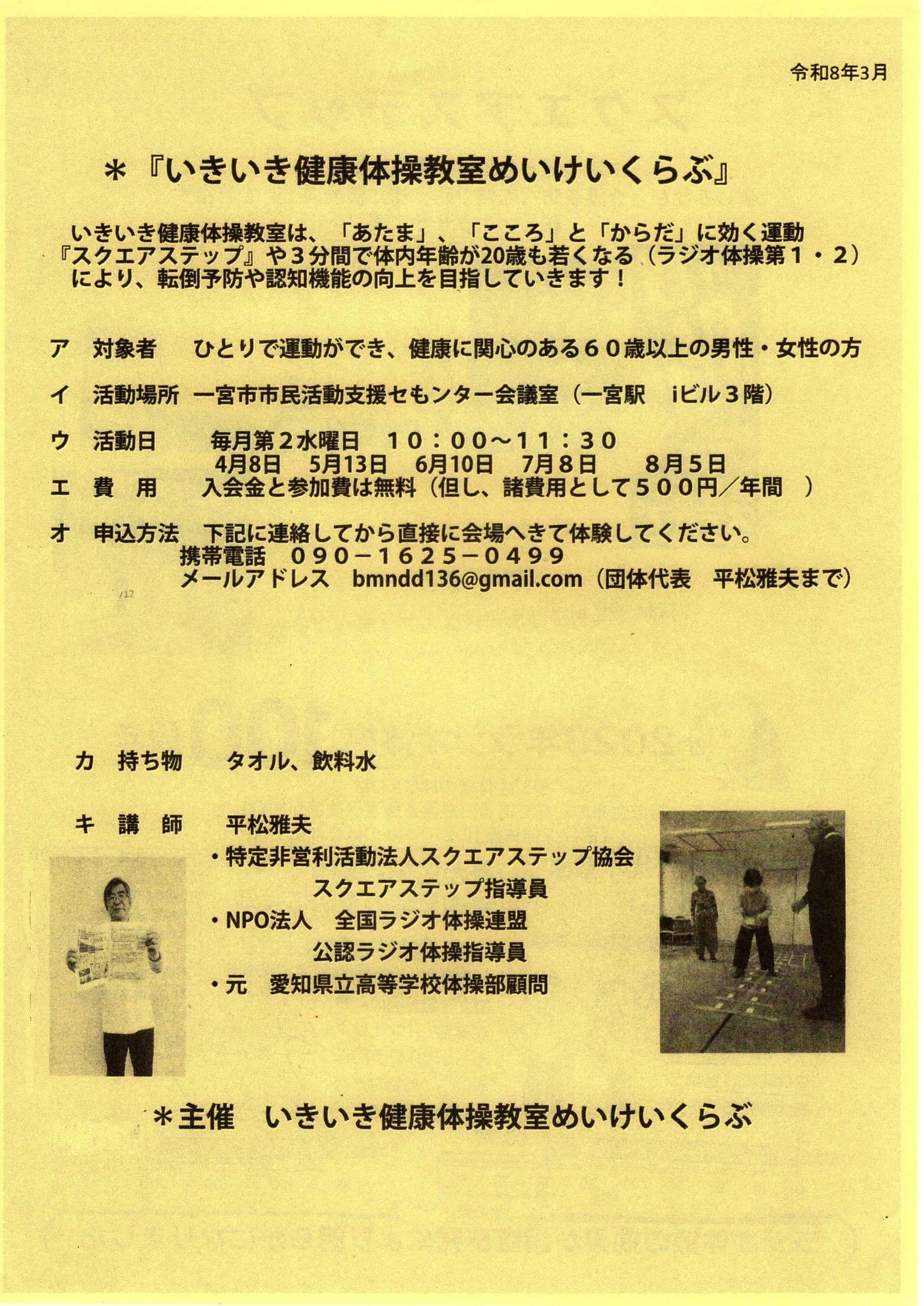 (登録団体からのお知らせ)いきいき健康体操教室めいけいくらぶ 【いきいき健康体操教室めいけいくらぶ】