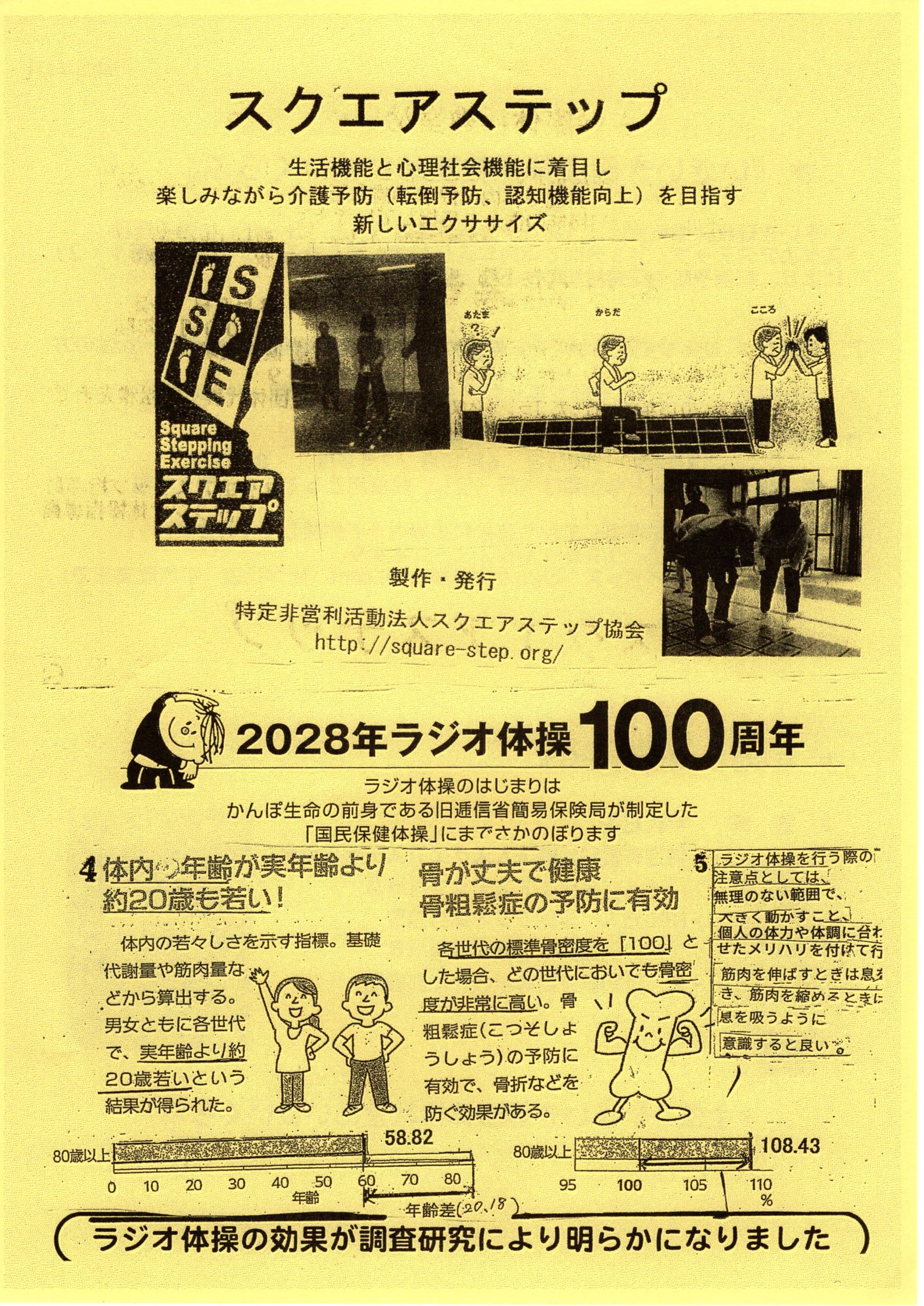 いきいき健康体操教室は、「あたま」、「こころ」と「からだ」に効く運動『スクエアステップ』や3分間で体内年齢が20歳も若くなる(ラジオ体操1・2)により、転倒防止や認知機能の向上を目指していきます!