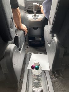 チェックシートは、完全な一旦停止、左折時の目視など安全確認、交差点では左方優先などがありました。運転席と助手席の間には鈴がついたペットボトルを置いて、倒れるような運転は避け、利用者を送迎するため、安心安全運転を心がけます。